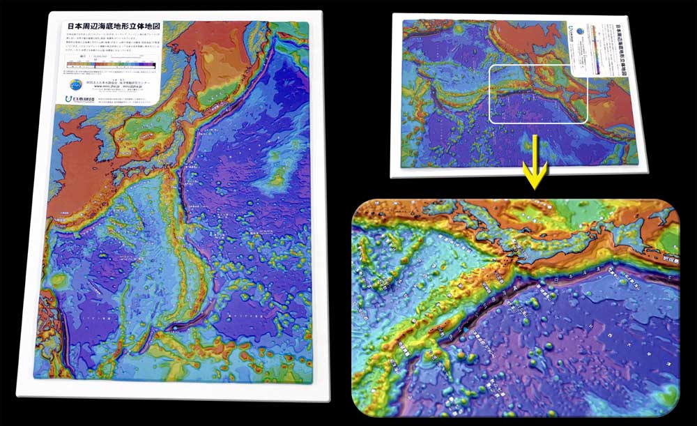 日本周辺海底地形立体地図製品の概要MIRCが保有する海底地形データを基に,日本周辺の海底地形を1:16,000,000の縮尺で,起伏15倍に誇張して作成した立体地図です. 500m間隔で彩色し,主な地名が白抜き文字で印刷されています. 学習教材や各種展示などにご利用下さい. 仕様